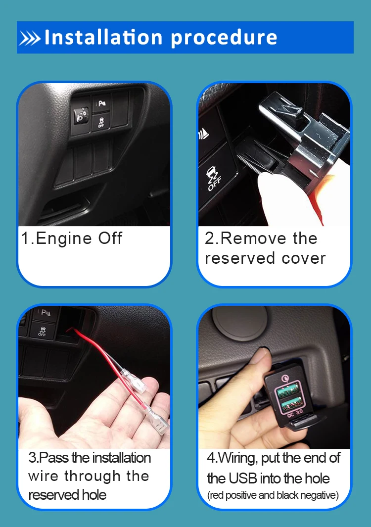 Packing:1*USB port charger,1*power cable fuse box retractor,1*installation instructions